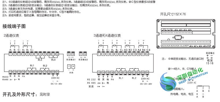 XSD、XSDAL系列儀表,2~4路模擬量輸入同時顯示,最多4路隔離變關,8點報警。可與各類模擬量輸出的傳感器、變送器配合,完成溫度、壓力、流量、液位、成分以及力和位移等物理量的測量、變換、顯示、傳送和控制。具有多種通道間運算方式,如加、減、比較等,并可針對運算結果進行變送和報警。